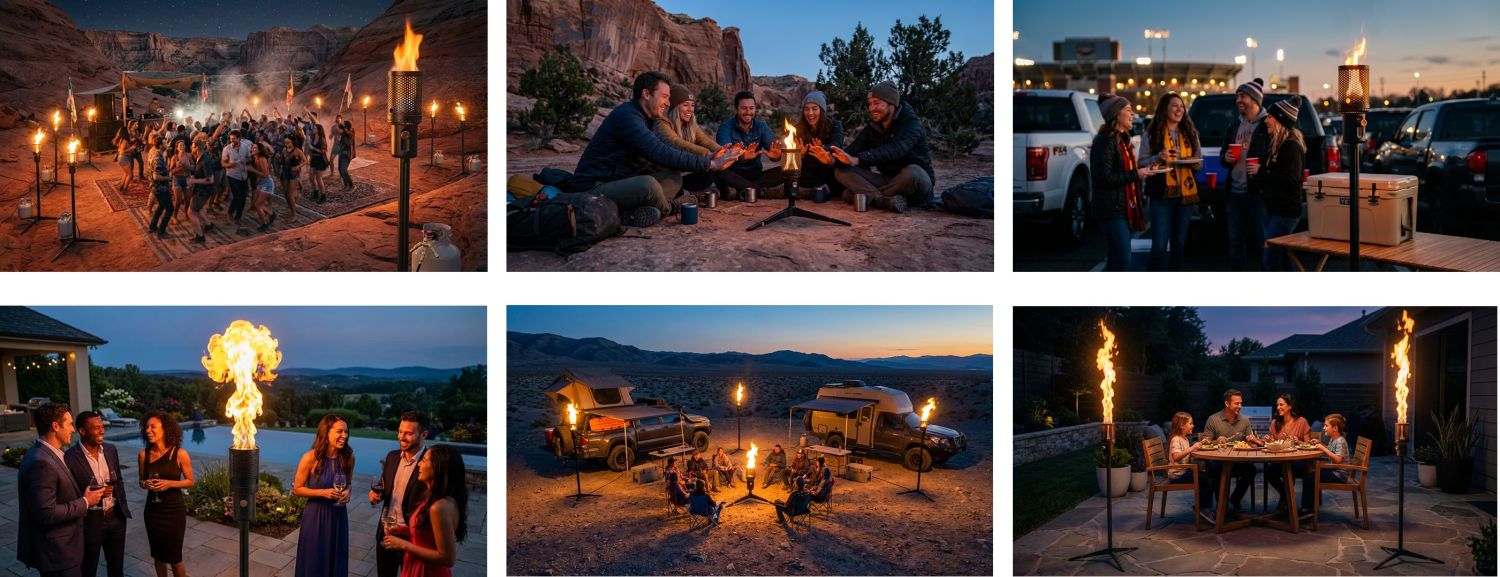 With five height modes from knee-height Camp Mode (2')to full Torch Mode (6'4") you can place firelight where it creates the most impactful effect: lighting faces, defining a perimeter for safety, or pulling a crowd toward the glow.